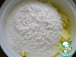 Добавить в творожную массу просеянную муку с разрыхлителем.