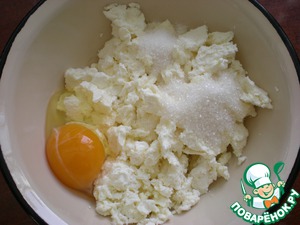 Смешаем оставшиеся 200 г творога с яйцом, сахаром, ванильным сахаром и крахмалом.
