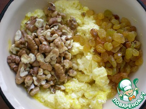 Добавить к творогу орехи и изюм. Я потом всю массу пробила слегка блендером. Если не хотите, не делайте этого, но тогда орехи измельчите чуть меньше, чем у меня.