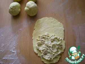 Каждую часть раскатайте в овал. И на половину овала нанесите творожную начинку. -