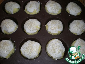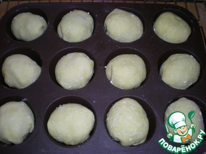 Тесто разделите на 12 частей. Булочки я пекла в формочках для маффинов. Поэтому и столько частей. Можете их печь просто на противне.