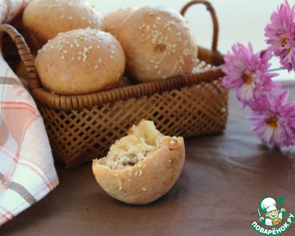 Не хотите заморачиваться? Сделайте из теста лепешку и в середину положите начинку. Но мне понравилось делать в виде рулета – так начинка равномерно распределена по всей булочке. -