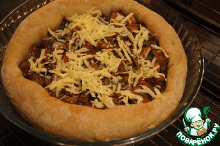 Затем открываем духовку и посыпаем пирог сыром. Даём ему постоять в духовке ещё 5 минут.