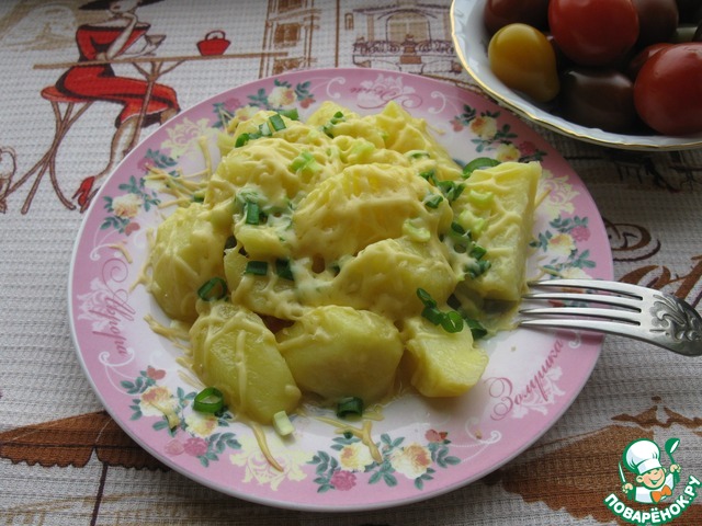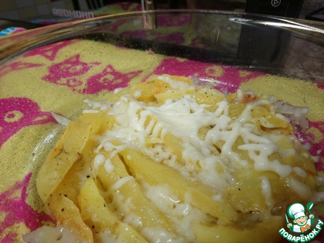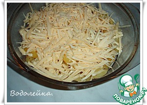 Перед натиранием сыра выкладываю картофель на блюдо, только потом посыпаю сыром и отправляю в СВЧ.