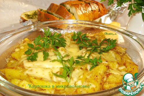 Это вариант рецепта по мотивам приготовления картошки в пакете (причем целлофановом). Сами понимаете, целлофановый пакет - это не очень хорошая идея. Можно пойти и другим путем, использовать рукав для запекания. Но... и тут есть но... У меня, например, они не всегда есть дома. А вот посуда для СВЧ всегда под рукой. Такая картошка выручит в любой ситуации (нужно быстро приготовить ужин или обед, неожиданные гости...)