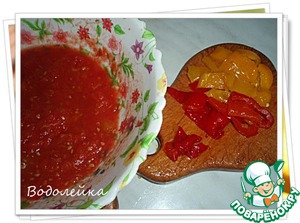 Очищенные перцы нарезать соломкой. А помидоры измельчить в пюре.