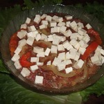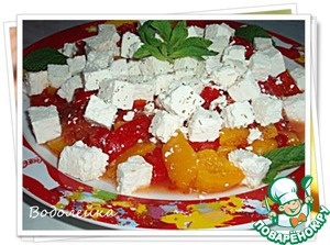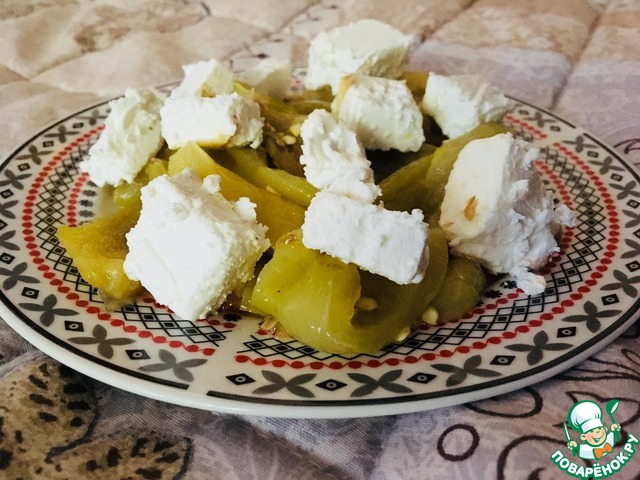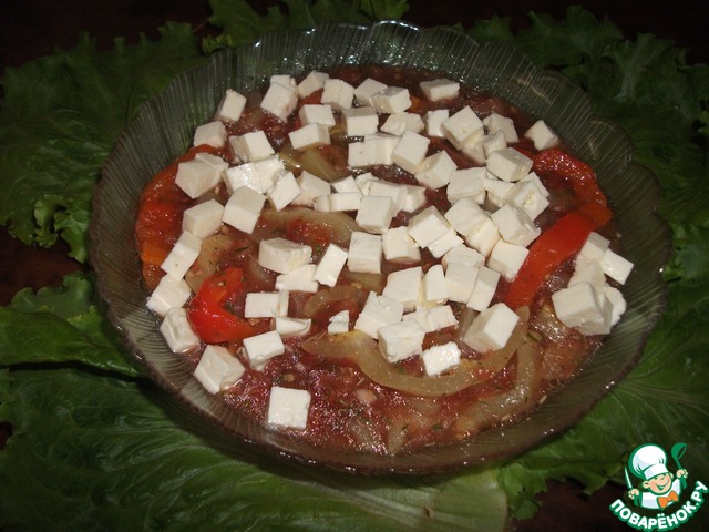 Выкладываем готовую закуску на блюдо, сверху кладем кусочки сыра. Украшаем по желанию.