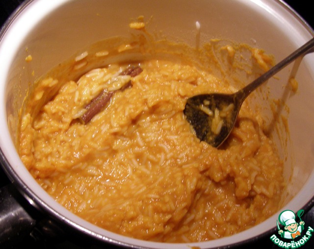 В сваренный рис добавим тыквенное пюре, можно готовое или же запеченную тыкву размягчить в пюре, кокосовую стружку и сахар, можно добавить мед тоже (1 ст. л.)