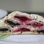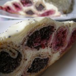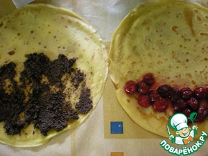 Теперь займемся сборкой нашей запеканки. Три блина нужно смазать маковой начинкой. На три блина уложить вишню. Начинку распределите до половины блина. Чтобы удобнее было сворачивать блины. Теперь сверните блины в трубочку.
