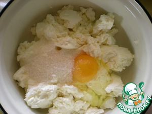 Для творожной прослойки нужно в творог добавить одно яйцо, размягченное сливочное масло, манку, сахар и пробить эту массу блендером до однородного состояния.