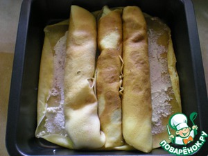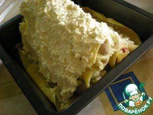 Один блин положите в формочку для запекания. Я ничем ее не смазывала, у меня блин не прилип. Смажьте слегка этот блин творогом и уложите на него блинные трубочки, чередуя начинки. В нижний слой положите три блина, смажьте творогом. Во второй – два, опять смажьте творогом и в третьем слое - один блин.