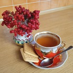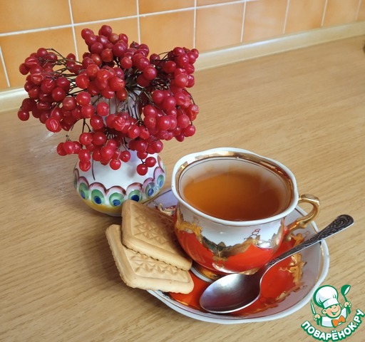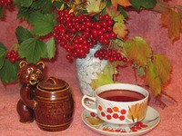 Описание: Чай с калиной любят не все за его специфический запах и горьковатый вкус, но о целебных свойствах знают все. Чай с калиной полезен, как для поднятия иммунитета, так и для борьбы с осенней простудой. Есть поговорка: не бывать калине - малиной. Но это не так. Калина по своим лечебным свойствам превосходит малину. Калина обладает потогонным, жаропонижающим свойствами, она является хорошим антисептиком. Ягоды калины убивают плесень, бактерии и простудные вирусы. Если нет возможности профильтровать или прокипятить воду, можно положить на дно сосуда горькую гроздь калины и через 2 часа воду можно будет пить без вреда для здоровья. Ягоды калины можно добавлять в обычный чай и пить с медом.