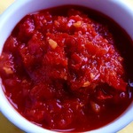 Красный горький перец без плодоножки и помидоры также пропустить через мясорубку. Добавьте хмели-сунели и ещe раз всe вместе пропустить через мясорубку.