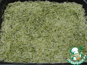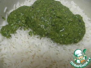 3.Рис отварить в подсоленной воде 15 минут до полуготовности, затем откинуть на дуршлаг, чтобы стекла вода, а затем смешать с песто. Можно купить песто в магазине, у меня он домашнего изготовления по рецепту поваренка "апайя", за что ей огромное спасибо. Вот ссылка https://www.povarenok.ru/recipes/show/42042/. Только вместо обычного базилика я использовала лимонный базилик, он к рыбе подходит идеально.