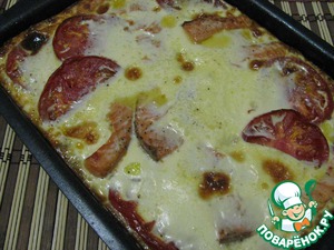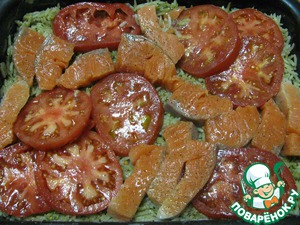 5.Сверху раскладываем помидоры и рыбу (произвольно). Посолить и поперчить.