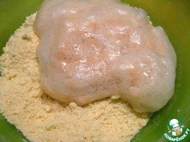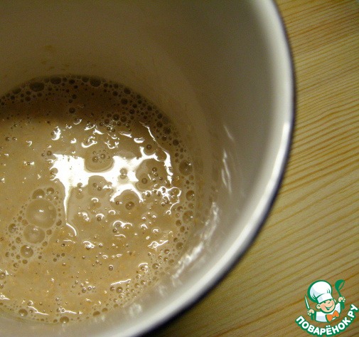 Дрожжи с 1 ч. л. сахара развести в 5 ст. л. теплой воды. Поставить в теплое место подойти.