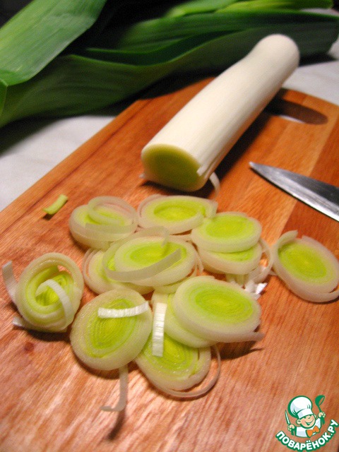 Бланшировать лук-порей 3 минуты в подсоленной воде, обдать холодной водой и дать ей стечь.