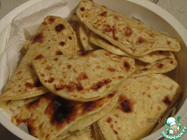 Готовые лепешки обжариваем на сухой (!!!) сковороде без добавления какого-либо масла! Лепешечка покроется пузыриками, и на ней появятся золотистые точечки, значит, готово!
