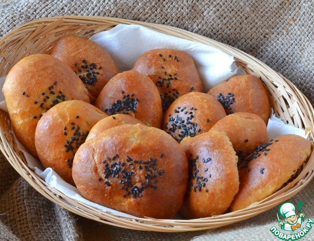 Начинку можно любую - кто что любит. Я делала с капусткой тушёной, а другие - с мясным фаршем, кунжут тоже интересненький вкус придаёт.