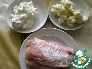 Филе нарежьте на маленькие кусочки и отправьте в блендер, чтобы превратил их в фарш. Через пару минут добавьте к фаршу творог и соцветия цветной капусты и еще раз хорошо пробейте. Безусловно, со всей этой работой может справиться и мясорубка.