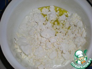 Добавить просеянную муку с разрыхлителем. Муку добавлять постепенно. Возможно, вам понадобиться другое количество муки. Тут все зависит от влажности творога. Масса должна быть слегка липкая. Пусть вас это не смущает. Не забивайте излишне ее мукой. Еще раз все размешать.