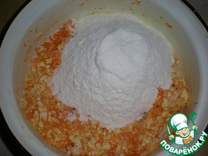 Добавить соль, сахар, натертую на мелкой терке морковь. Лучше, конечно, чтобы морковь была сладкая. Так как сахара здесь мало, то сладкая морковь отдает свою сладость лепешкам. Все хорошо перемешать ложкой.