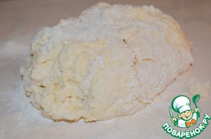 Замесить тесто, оно будет мягкое и нежное. Присыпаем его мукой и месим-месим, пока оно не перестанет липнуть к рукам и столу.