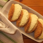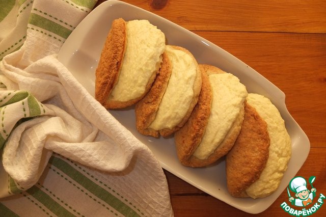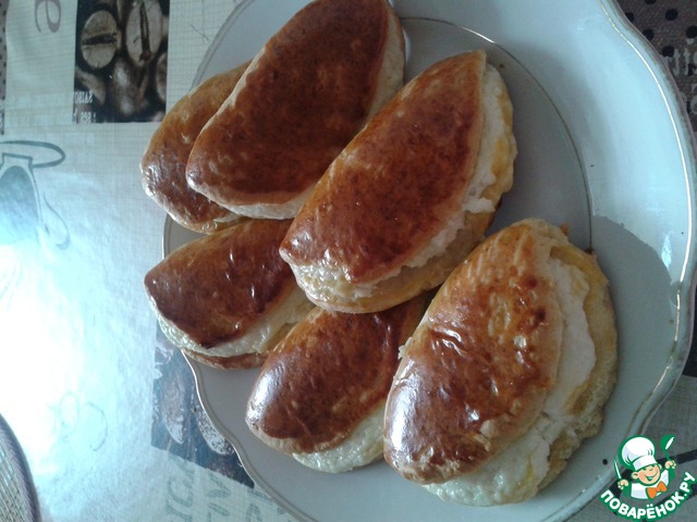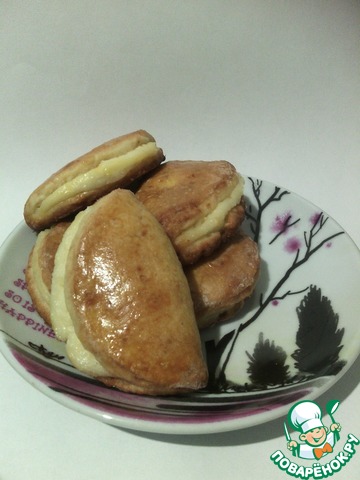 Охлаждённое тесто раскатать в пласт 5 мм, вырезаем кружочки, на половинку кружочка кладём начинку и складываем пополам, немного надавливая. Сверху смазываем желтком и выпекаем при 190 град. мин. 15-20.