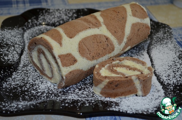 Рецепт теста для рулета взяла обычный бисквитный, Вы можете приготовить по своему любимому рецепту. Противень у меня маленький (20*30 см), т. к. духовка у меня маленькая, поэтому у меня получается из этой порции один рулетик, как на фото, и один маленький. Если у Вас противень большего размера, то и рулетик будет выглядеть намного симпатичнее.