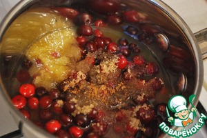 В кастрюле соединить клюкву, 1/2 стакана коричневого сахара, 1/4 стакана воды, апельсиновый сок, мед, корицу и душистый перец. Довести до кипения, убавить огонь и кипятить на слабом огне 15-20 минут до легкого загустения. Затем остудить. Такой соус можно хранить в холодильнике до 3 дней. Т. е. можно его сделать заранее, если нужно сократить общее время приготовления, например, перед праздником.