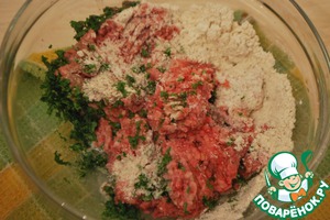 В миске смешать фарш, молоко, раскрошить хлеб (корочки срезать), добавить петрушку, мускатный орех, перец и соль. Тщательно перемешать.