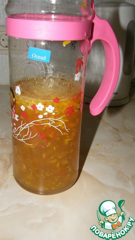 • Оставшийся сахар залить тремя стаканами чая, добавить сок лимонов и апельсина
