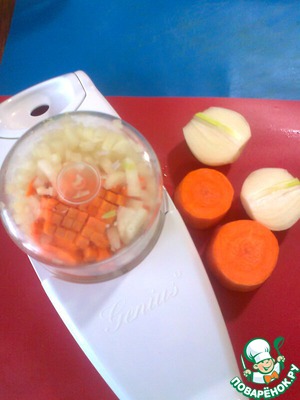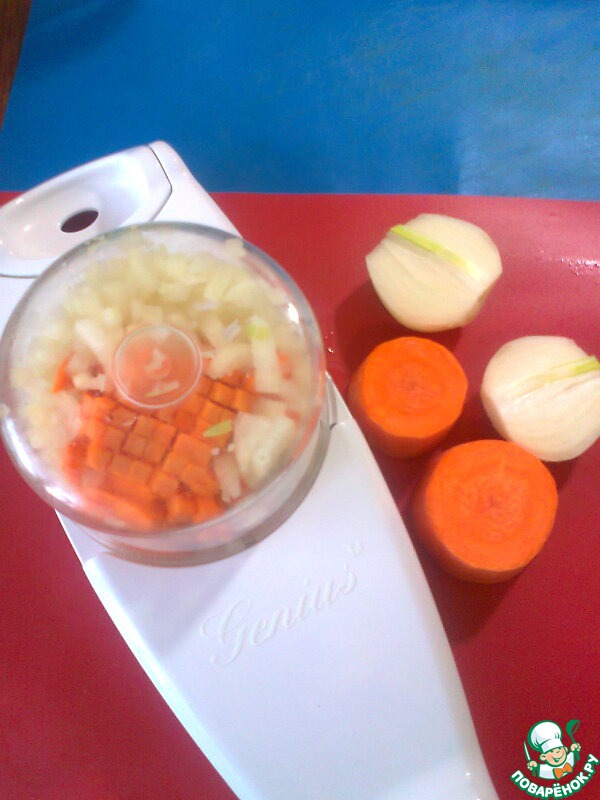 Пока мясо жарится, режем лук мелко и морковь тоненькими брусочками.