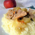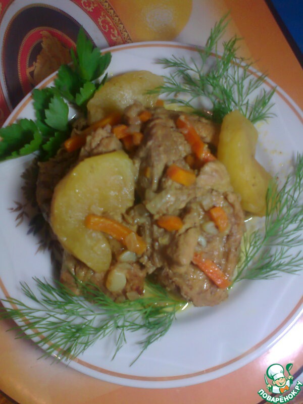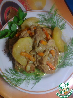 Тем временем яблоки чистим, режем брусочками, через 20 мин. добавляем к мясу и смотрим...