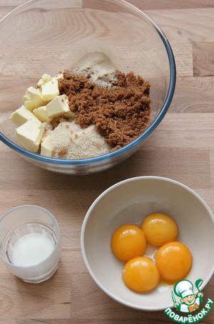 • Все очень просто. Желтки отделить от белков. Желтки взбить с маслом, с сахаром, молоком и ванильным сахаром в пышную массу. Я брала половину универсального коричневого сахара и половину сахара типа Димерара. Но можно ограничиться универсальным.