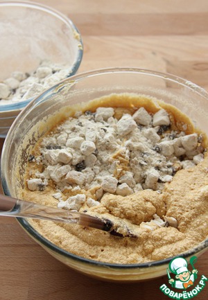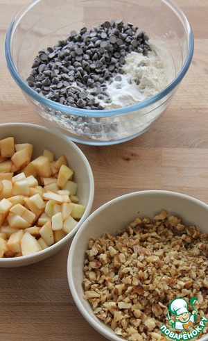 • Муку смешать с разрыхлителем, добавить в нее нарезанные мелкими кубиками яблоки, порубленные орехи и шоколад. (Я использовала шоколадные капельки).