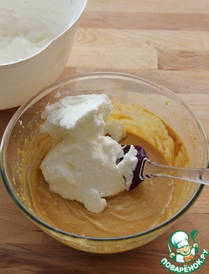 • Затем остророжно вмешать белки с желтково-сахарно-мас ляную смесь.