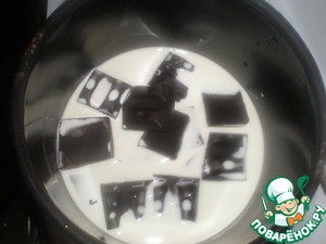 Поставьте сливки (жирные) - 120 мл с нарубленным шоколадом в кастрюльке на маленький огонь, помешивая до полного растворения шоколада. Глазурь должна быть однородной. Остудите до комнатной температуры.