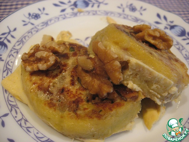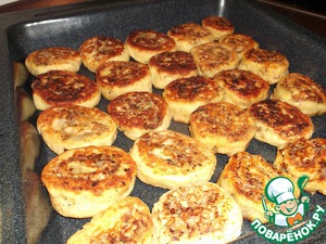На сковороду добавляем 40 г топлёного масла и обжариваем шайбы с двух сторон, примерно по 2 минуты. Обжаренные роллы выкладываем в ёмкость для запекания. -