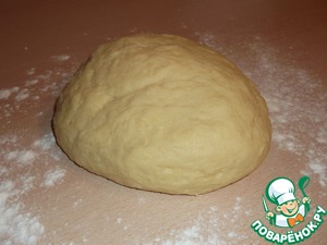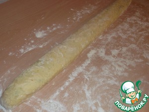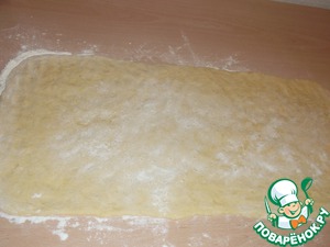 На припыленную мукой рабочую поверхность раскатываем картофельное тесто в прямоугольник 5 мм толщиной размером 30 * 60 см.