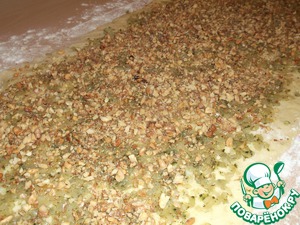 На тесто равномерно наносим остывший лук, разравнивая ножом, сверху покрываем рублеными орехами. -