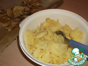 Готовый тёплый картофель разрезаем вдоль на две половинки и ложкой вынимаем мякоть.