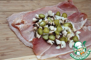• Шампиньоны, лук и огурчики нарезать, немного посолить, поперчить. Рулетик смазать небольшим количеством горчицы, накрыть ветчиной и на одну сторону положить начинку.