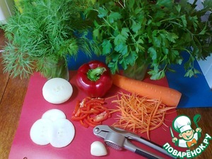 Ну что ж, начнём: лук режем кольцами, болгарский перец - соломкой, морковь натереть по-корейски, чеснок пропускаем через пресс, петрушку и укроп мелко режем.