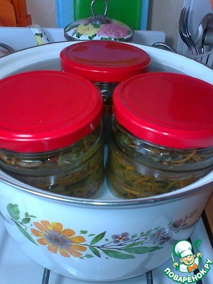 Затем всю эту вкуснятину раскладываем по банкам и ставим стерилизовать (1 л банки - 10-15 мин.; 0,5 л банки - 8-10 мин.)