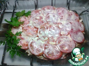 Через час намазываем нашу рыбку майонезом. По всей поверхности укладываем лук колечками, чуть присаливаем. Сверху лука укладываем помидоры кружочками, также чуть присаливаем.