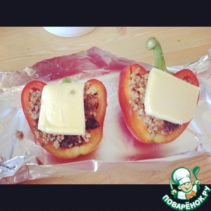 Разрезать перец на половинки. Удалить внутренности. Заполнить каждую половинку нашей начинкой.