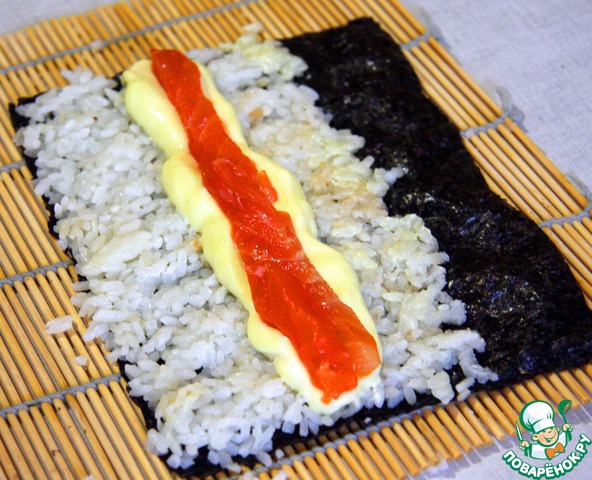 Затем делаем острый ролл. Начинка - семга и острый соус из майонеза и васаби. Сворачиваем ролл и режем.