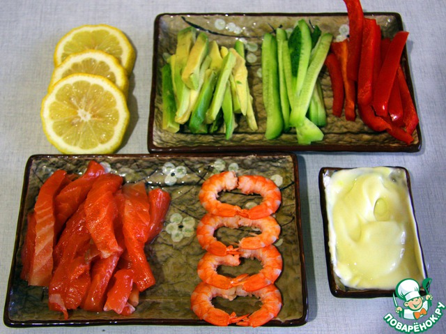 Из этого набора продуктов получится 4 разных ролла: с семгой, с креветкой, овощной и острый ролл.
