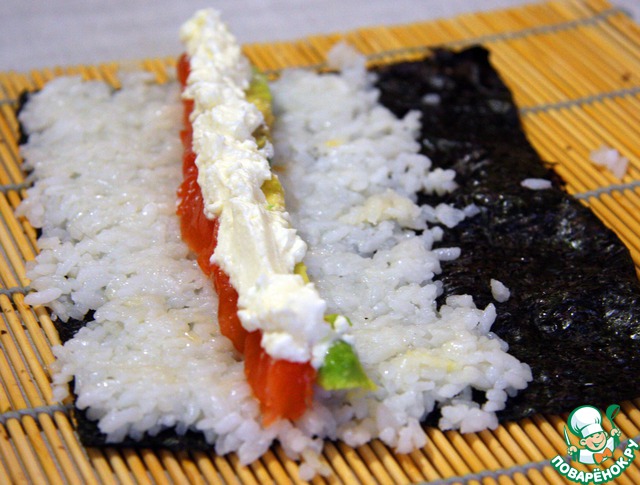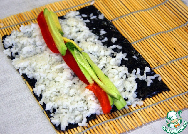 Равномерно по нори распределяем тонкий слой риса. Поставьте рядом с собой воду - если рис сильно прилипает к рукам, то их нужно немного смочить водой. Верхний край (2-3 см) оставляем без риса (чтобы ролл скрепился). Выложили рис - максимально уплотняем его (прессуем пальцами). Затем на середину выкладываем начинку: соломку перца, огурца и авокадо. Равномерно, по всей длине ролла.